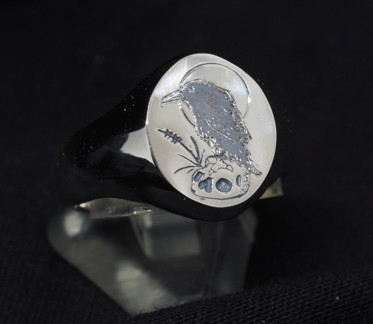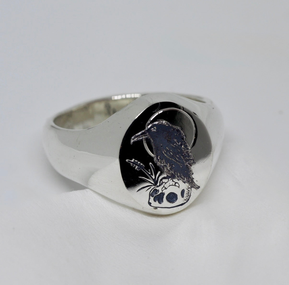 This ring is off sterling silver and is Solis at size T. It features a hand-engraved raven standing on a skull with a moon in the background. The raven is blacked with a reverse on the engraving to be polished to make it pop.